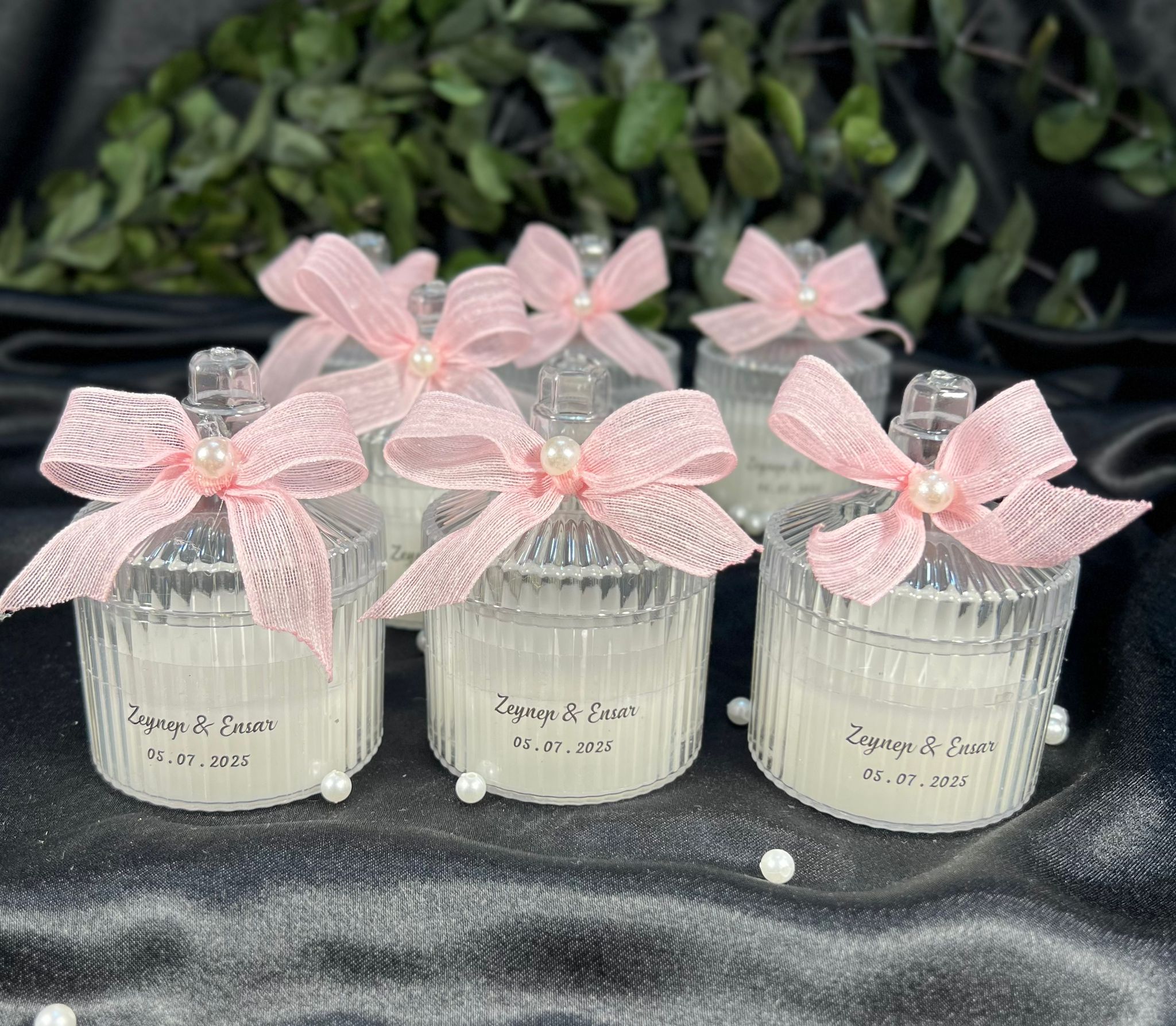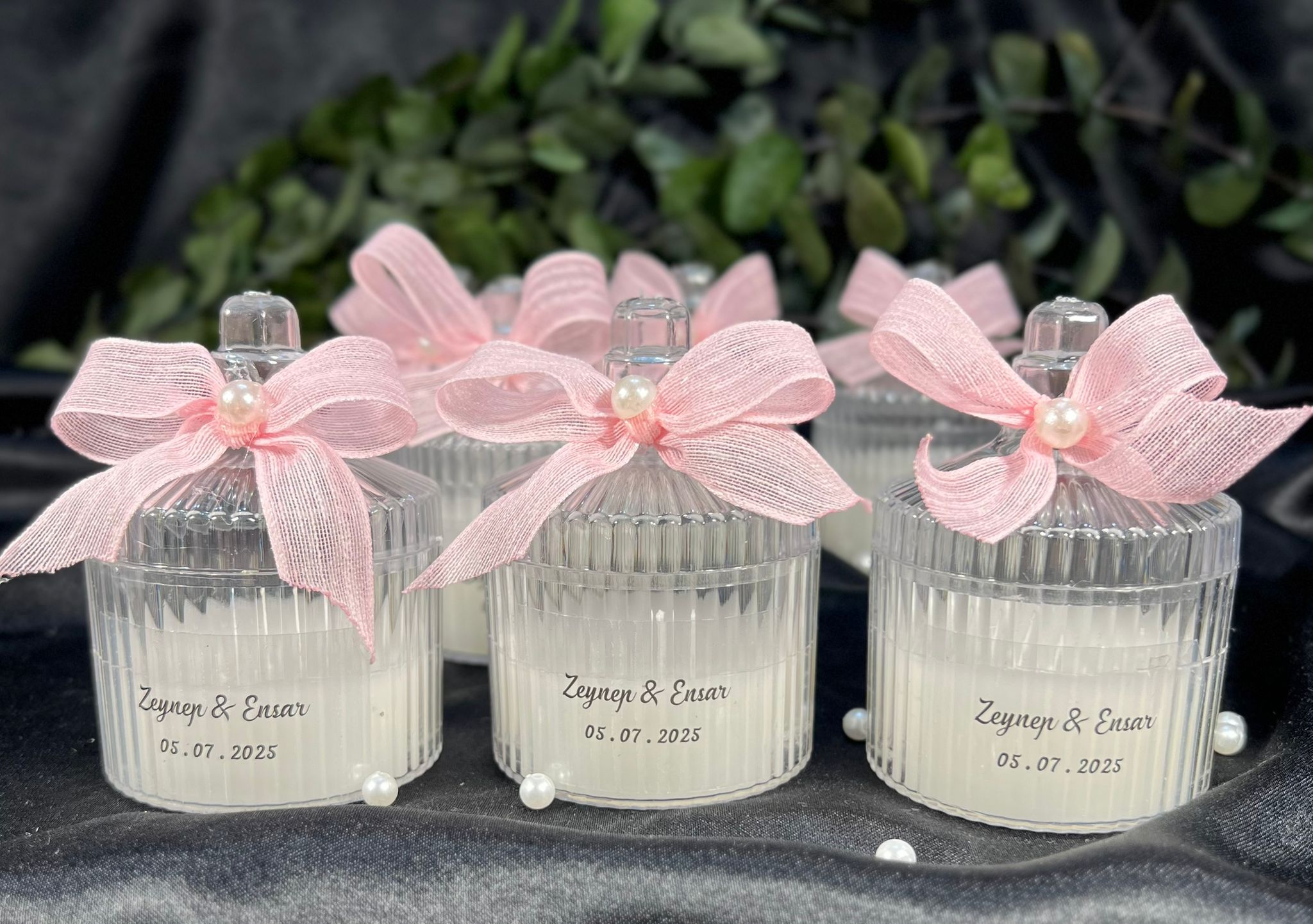 Şekerlik tasarımlı mumluk. Kurdeleli veya ortanca çiçekli olarak yapılır.